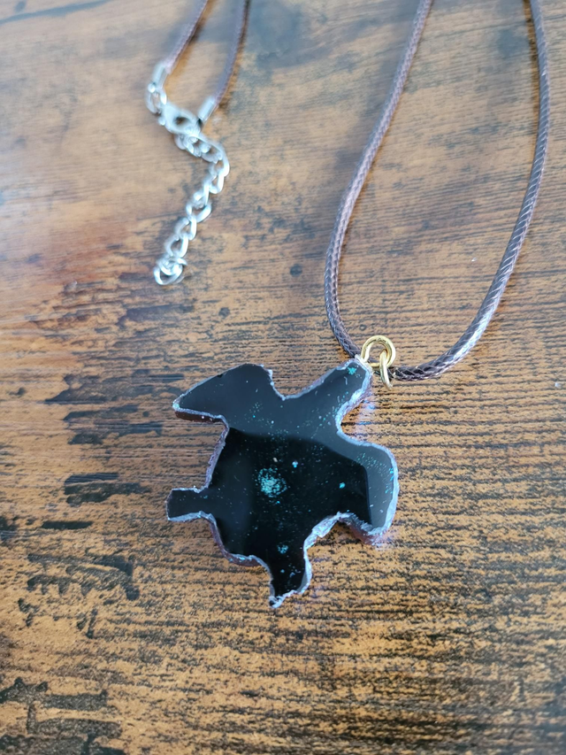 Collier cordon marron foncé avec pendentif fait en résine époxy avec de la poudre mika caméléon