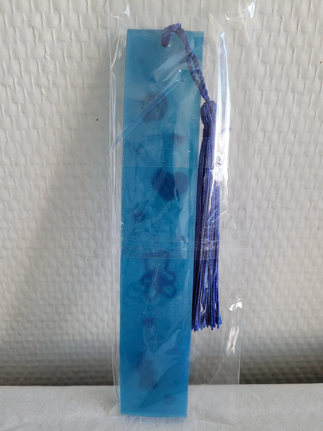 Joli marque-pages fait en résine époxy de couleur bleu avec des petits breloques dedans sur le thème bébé.