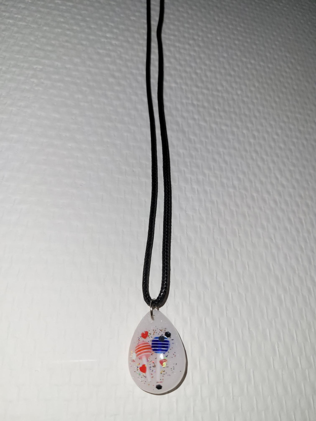 Avec cordon noir et son pendentif fait en résine époxy avec minis sucettes dedans. Fabrication artisanale